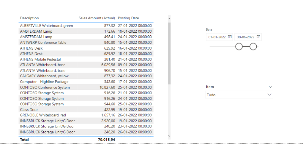 Com este pequeno exercício conseguimos ter uma listagem de vendas de determinado produto. Se desejarmos filtrar para determinado produto ou para uma data específica ou intervalo de datas, pode-se repetir como descrito no passo filtragem do “Sales Amount (Actual)”, ou utilizar a partir da aba de visualização um visual chamado “Segmentação de Dados” (Slicer) e colocar nele o campo de data ou de produto.